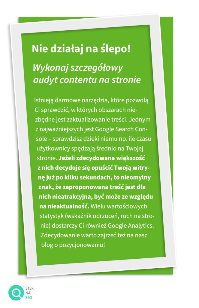 Gigantowi z Mountain View, a tym samym jego algorytmom, zależy przede wszystkim na tym, aby dostarczyć użytkownikowi dokładnie takie treści, jakie są mu potrzebne. Dlatego treści na stronie Twojej firmy, sklepu internetowego czy bloga wcale nie muszą (a nawet nie powinny!) być nieustannie odświeżane. Wystarczy, jeżeli będą możliwie jak najbardziej użyteczne dla odwiedzających, czyli aktualne i użyteczne.