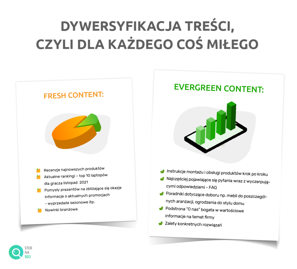 Aby osiągnąć optymalną skuteczność pozycjonowania stron, musisz zadbać o odpowiednią równowagę między świeżymi treściami pozwalającymi wykorzystać algorytm Google Freshness do wypracowania wyższych pozycji w rankingu, a tzw. evergreen contentem, czyli uniwersalnymi treściami, których nie nadgryzie ząb czasu. Idealnym przykładem są tutaj choćby artykuły poradnikowe na temat pielęgnacji, montażu czy konserwacji zakupionych u Ciebie produktów. Niezwykle popularną praktyką jest też dodawanie rozbudowanej sekcji FAQ, gdzie użytkownik znajdzie wszystkie najważniejsze informacje np. na temat dostawy, metod płatności, zwrotów, gwarancji, możliwości wykonania wyrobów pod określony wymiar lub zgodnie ze specyfikacją.