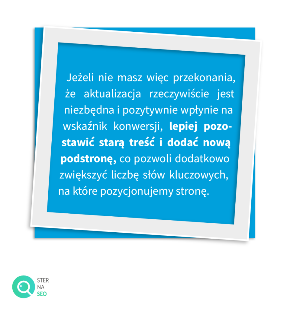 Koniecznie trzeba pamiętać, że świeżość jest tylko jednym z wielu czynników rankingowych Google, a w przypadku bardzo dużej liczby zapytań algorytmy w ogóle nie biorą jej pod uwagę. Dlatego na aktualizację istniejących już treści powinniśmy decydować się tylko wówczas, jeżeli jesteśmy w 100% pewni, że uda nam się zwiększyć ich atrakcyjność dla użytkownika. Sama zmiana daty publikacji nie ma zbyt wiele sensu – dla algorytmu Google Świeżość liczy się głównie moment, w którym dana podstrona została zindeksowana po raz pierwszy.
