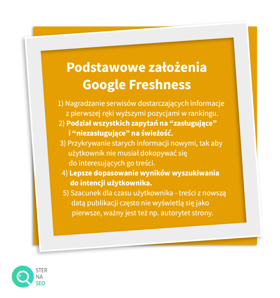 Był to jednak dopiero początek internetu, który znamy dzisiaj – kolejne zmiany przyniosły późniejsze aktualizacje Google, w tym algorytm Świeżość (Freshness) wdrożony 3 listopada 2011 r., który jeszcze to wszystko usprawnił i umożliwił znacznie łatwiejsze wyszukiwanie aktualnych treści. Dla większej przejrzystości, jego główne założenia przedstawiliśmy na infografice: