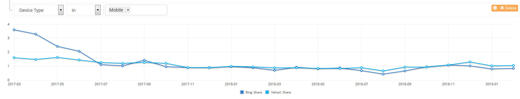 Bing razem z Yahoo! (które ma silnik oparty właśnie o rozwiązania Binga) w 2012 odpowiadały za ok. 30% wszystkich zapytań internetowych zadawanych przez mieszkańców Stanów Zjednoczonych. Stany nie są oczywiście całym światem – a w kontekście globalnym, w 2019 roku wskaźniki Binga i Yahoo są zdecydowanie mniejsze – samodzielny Bing ma ok. 8% udziału w rynku, a Yahoo ok. 4% (w najlepszych dla nich szacunkach). Wyniki mówią same za siebie – zarówno na urządzeniach stacjonarnych, jak i mobilnych, Bing oraz Yahoo przegrywają i zaliczają powolne spadki:
