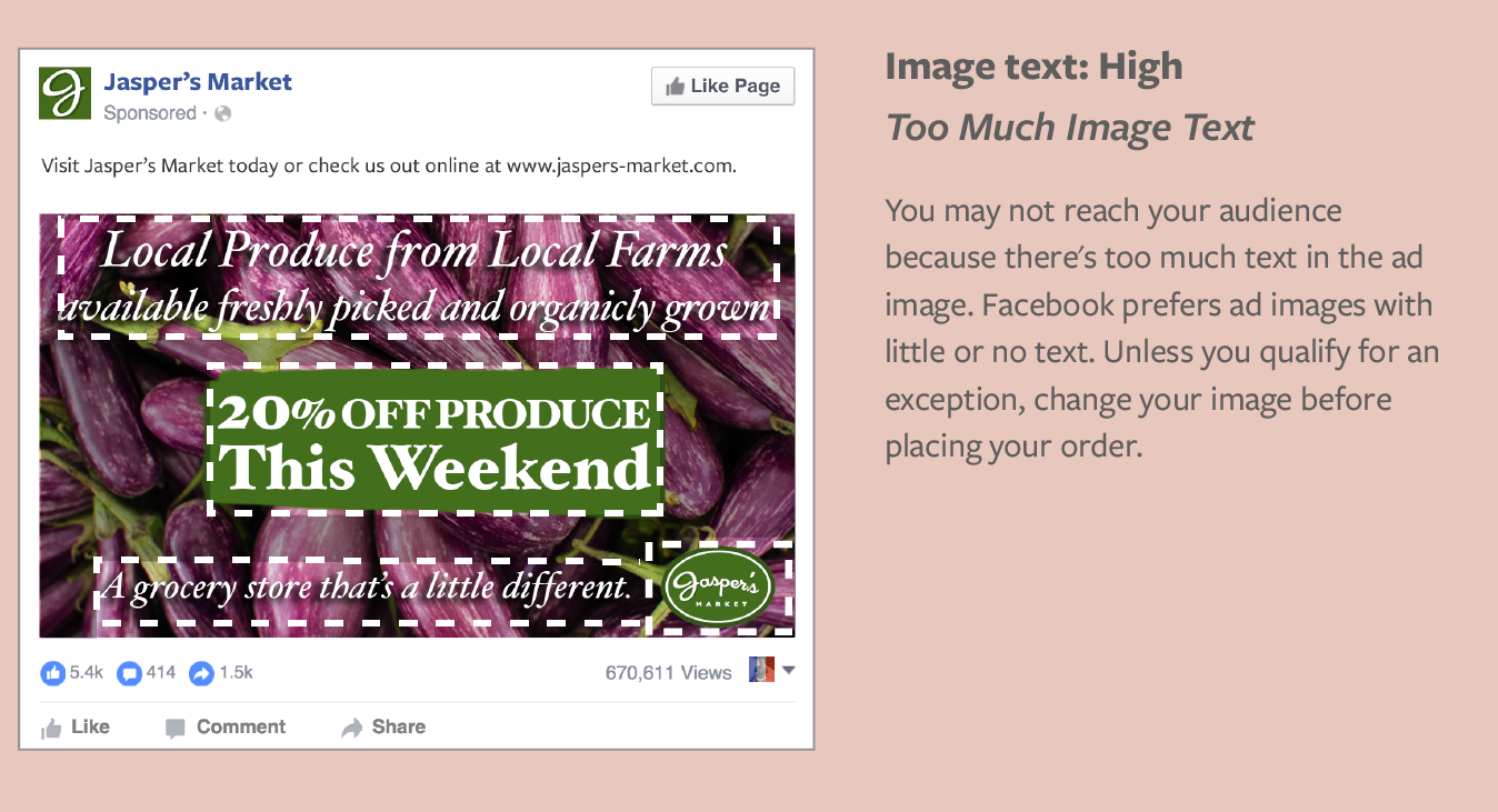 Przez ostatnich kilka lat obowiązywała reguła, w myśl której reklamy z grafikami zawierającymi tekst zajmujący więcej niż 20% powierzchni obrazka były niezgodne z zasadami Facebooka. Skutkowało to automatycznym odrzuceniem ich przez system dodawania reklam. Oczywiście od tej reguły istniały wyjątki, niemniej jednak było to dość uciążliwe.