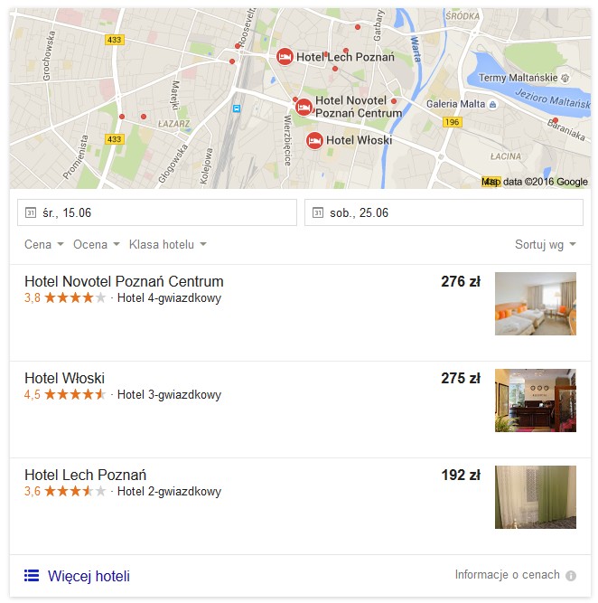 Osoby, które wpiszą w klasyczną, czy też lokalną wyszukiwarkę frazę „hotel [miasto]” zobaczą wizytówki hoteli opatrzone aktualną ceną za pokój, a także będą mogły szybko dokonać rezerwacji w interesującym je terminie