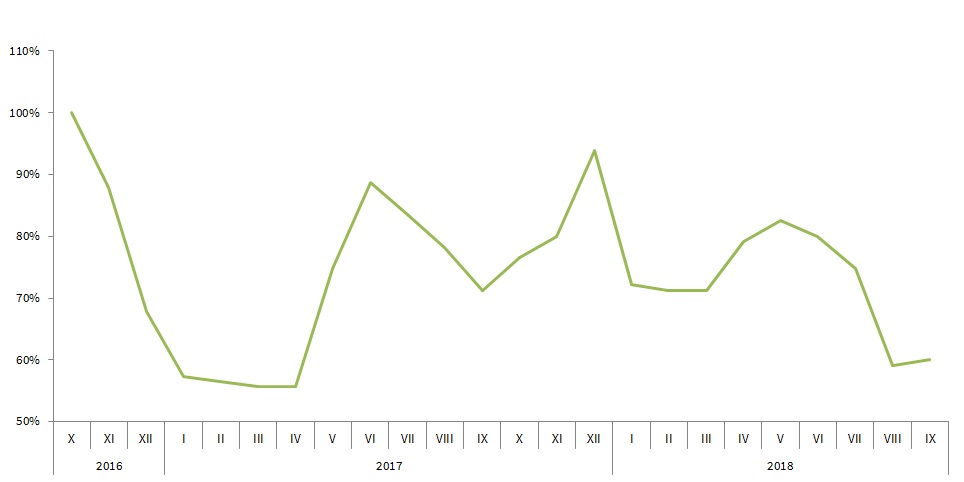 Wykres prezentuje wskaźnik CTR od października 2016 r. do września 2018 r. Źródło: Google Search Console