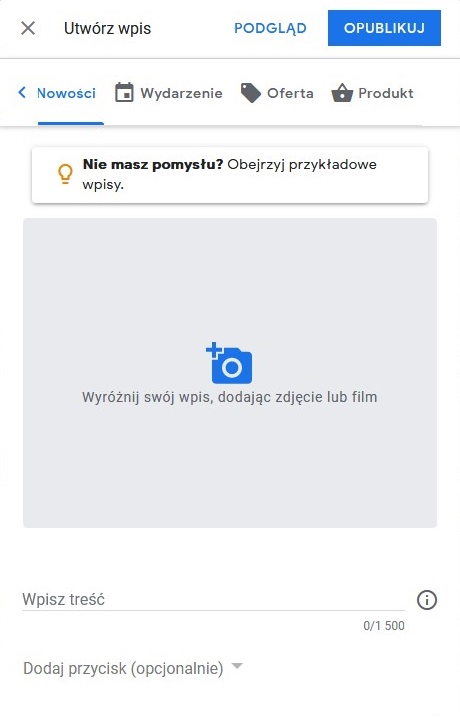 Wygląd gotowego wpisu w każdej chwili sprawdzić można dzięki funkcji podglądu. Po uzupełnieniu wszystkich danych i kliknięciu przycisku „Opublikuj”, wpis zostanie umieszczony na wizytówce.